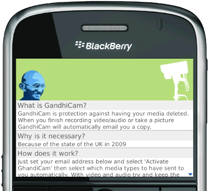 GandhiCam for post-8700-series Blackberry devices is an application that will automatically wirelessly upload your pictures or video as they are taken to prevent confiscation by the police. This application is a response to a spate of incidents in which UK police have deleted or confiscated pictures taken by tourists or by protesters at events like the G20 summit.