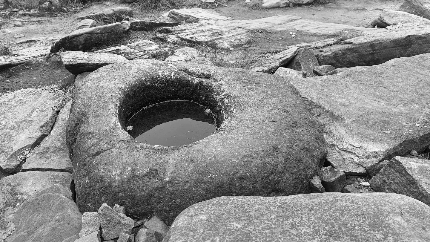 20240529_clachtoll_broch_lento_orl_mono_standard_a142_1716975188.jpg: The main entrance in the middle, and two dark side rooms either side (16kB) - view original 373kB